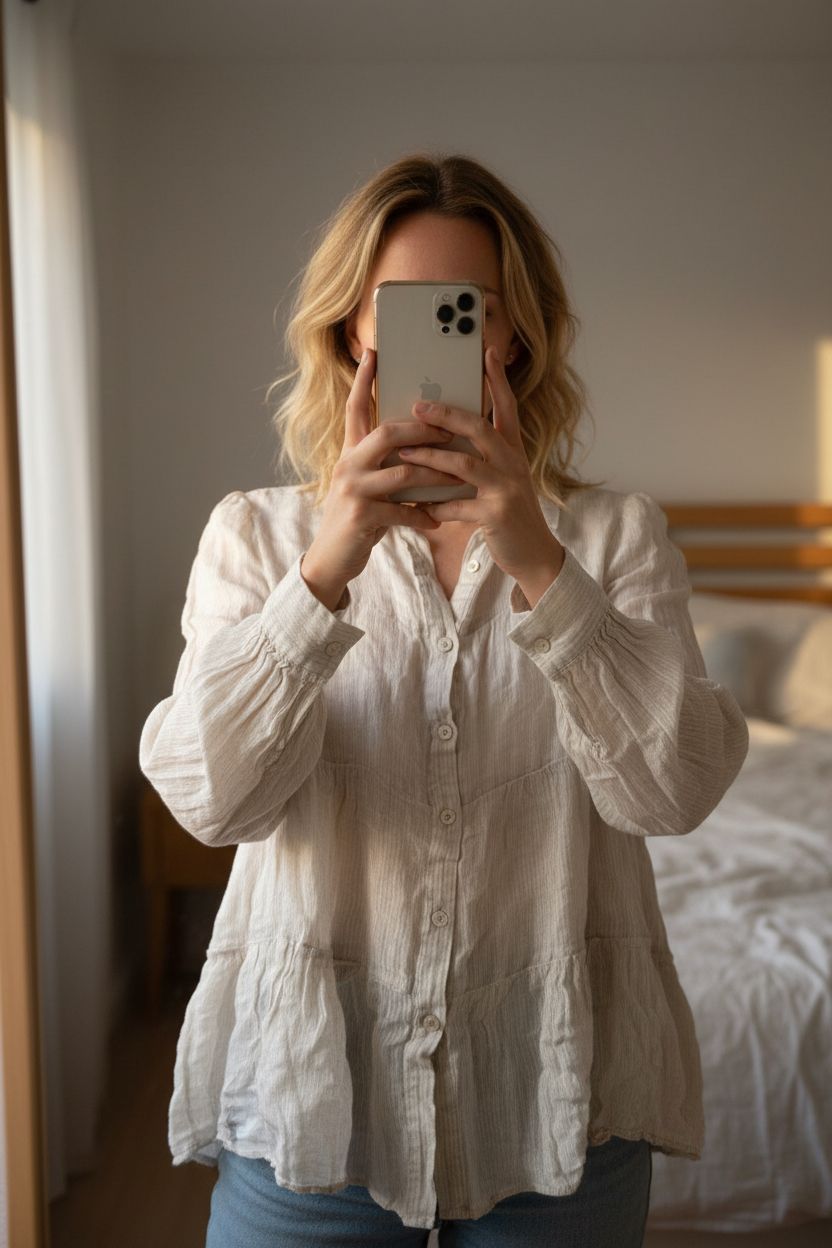 Chemise blouse Zara beige m - Camicia Zara donna M in piedi, rivolto verso la fotocamera, in una camera da letto con luce soffusa e luce naturale che filtra dalla finestra.