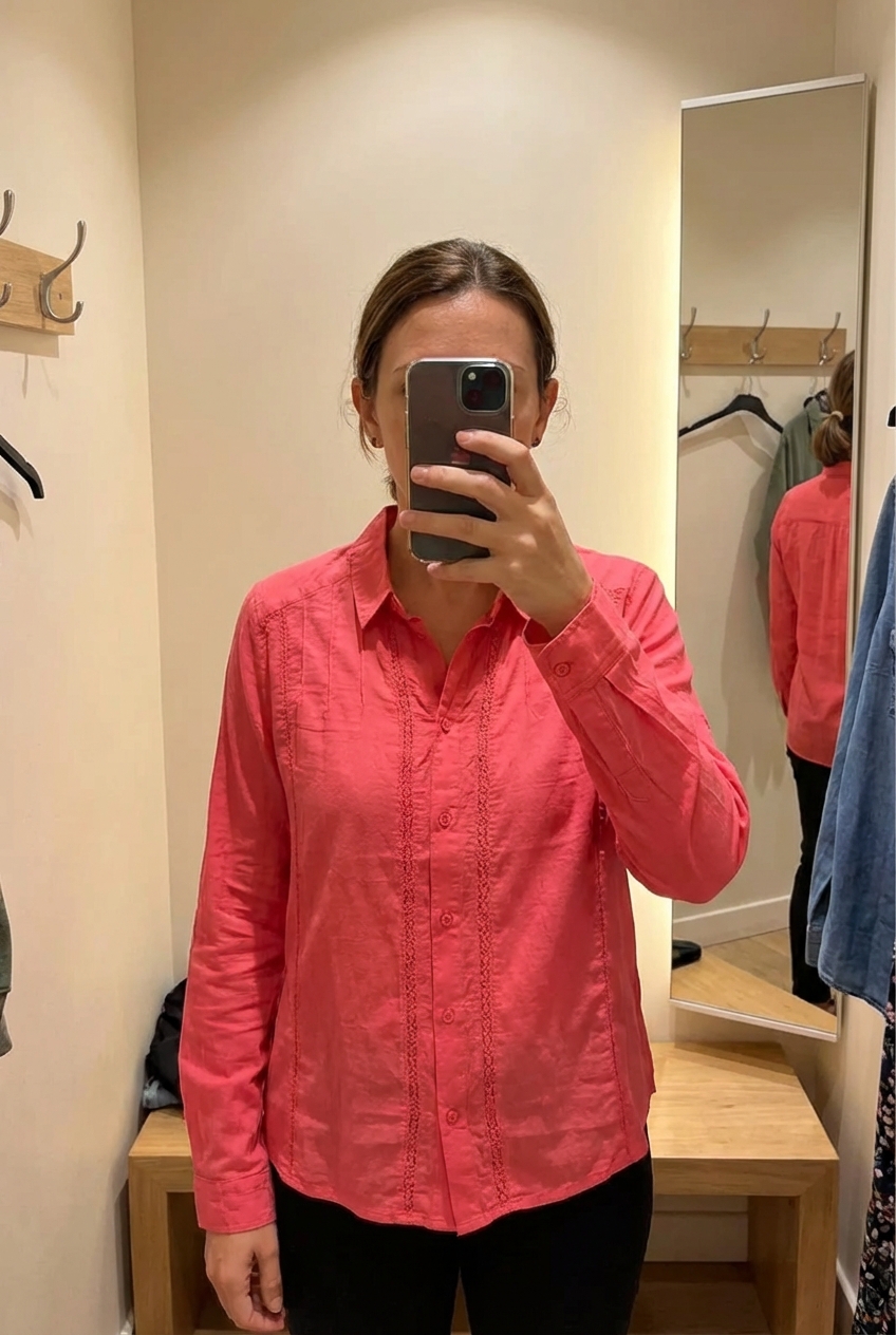 Une personne en Chemise captain tortue debout, face à la caméra, dans une cabine d’essayage de style boutique avec un miroir et une décoration neutre.