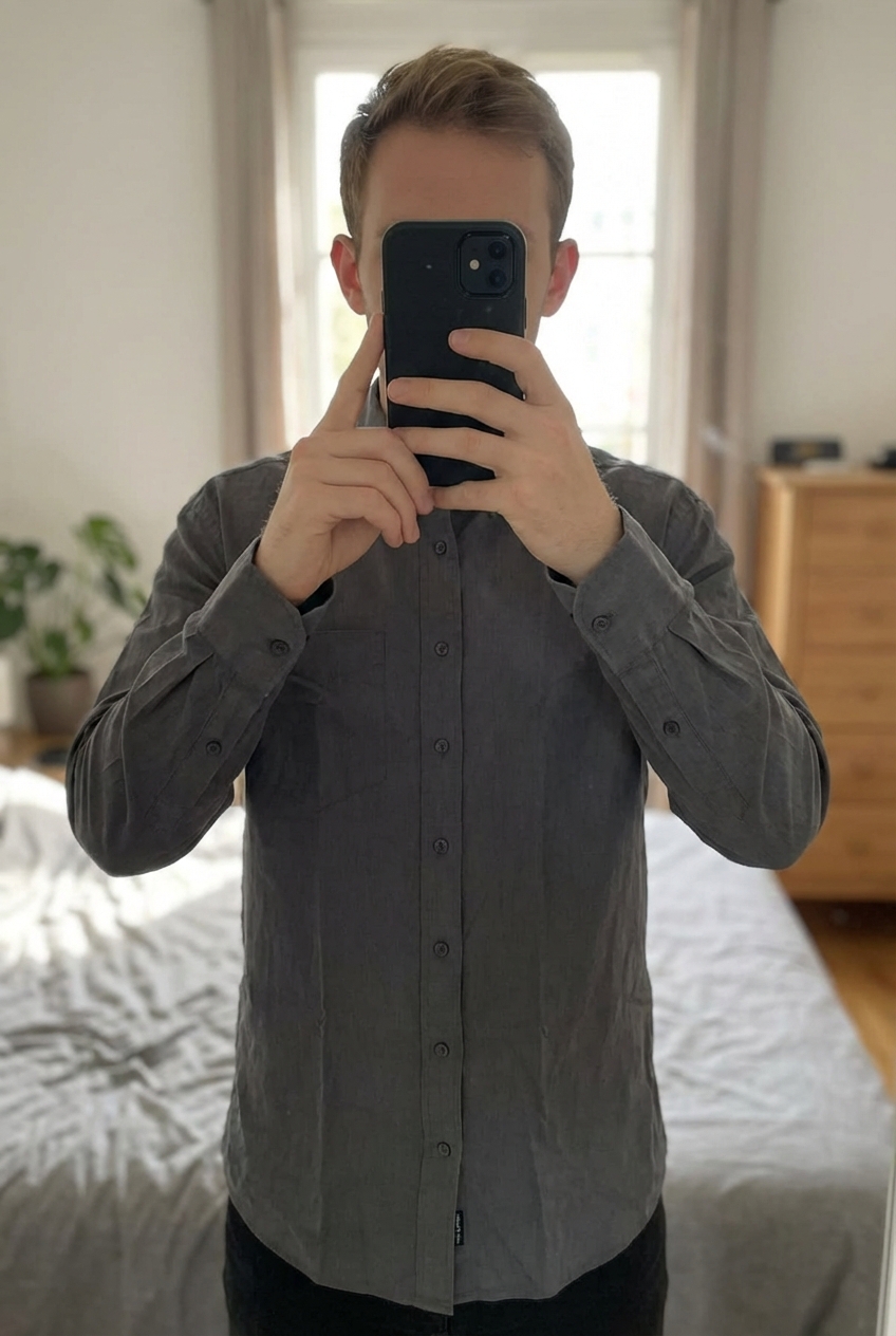 Chemise Celio classique Taille M debout, face à la caméra, dans une chambre à la lumière douce, avec une lumière naturelle filtrant par la fenêtre.