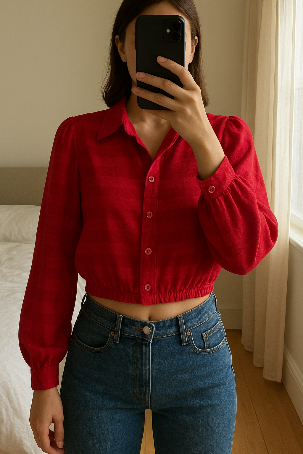 Chemise courte manches longues rouge neuve debout, face à la caméra, dans une chambre à la lumière douce, avec une lumière naturelle filtrant par la fenêtre.