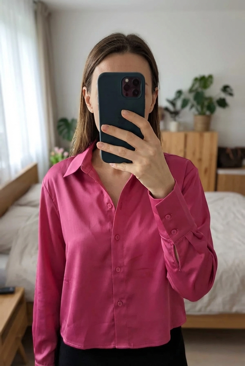 Chemise courte Pimkie rose satinée Taille XS 🌸 debout, face à la caméra, dans une chambre à la lumière douce, avec une lumière naturelle filtrant par la fenêtre.