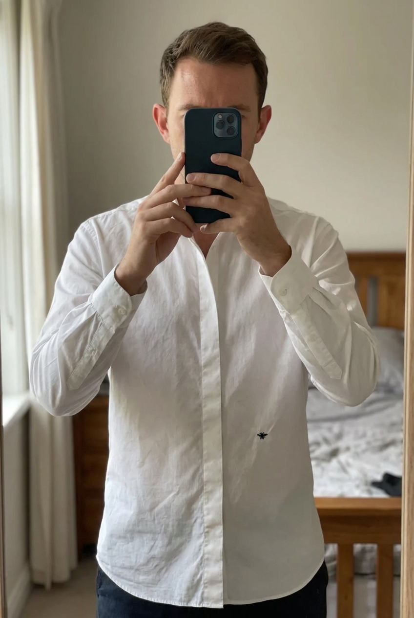 Chemise Dior abeille debout, face à la caméra, dans une chambre à la lumière douce, avec une lumière naturelle filtrant par la fenêtre.
