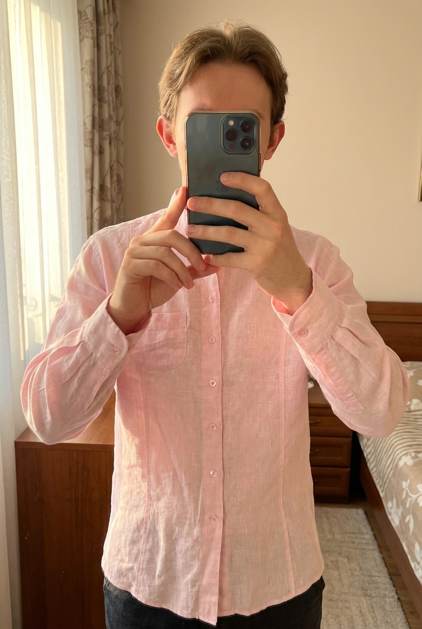 Chemise en lin debout, face à la caméra, dans une chambre à la lumière douce, avec une lumière naturelle filtrant par la fenêtre.