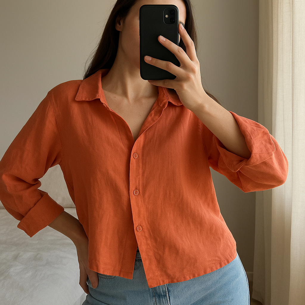 Una persona in Chemise femme M corail - Maglietta Camicia Donna M inarcando leggermente la schiena per una posa dinamica, in una camera da letto con luce soffusa e luce naturale che filtra dalla finestra.