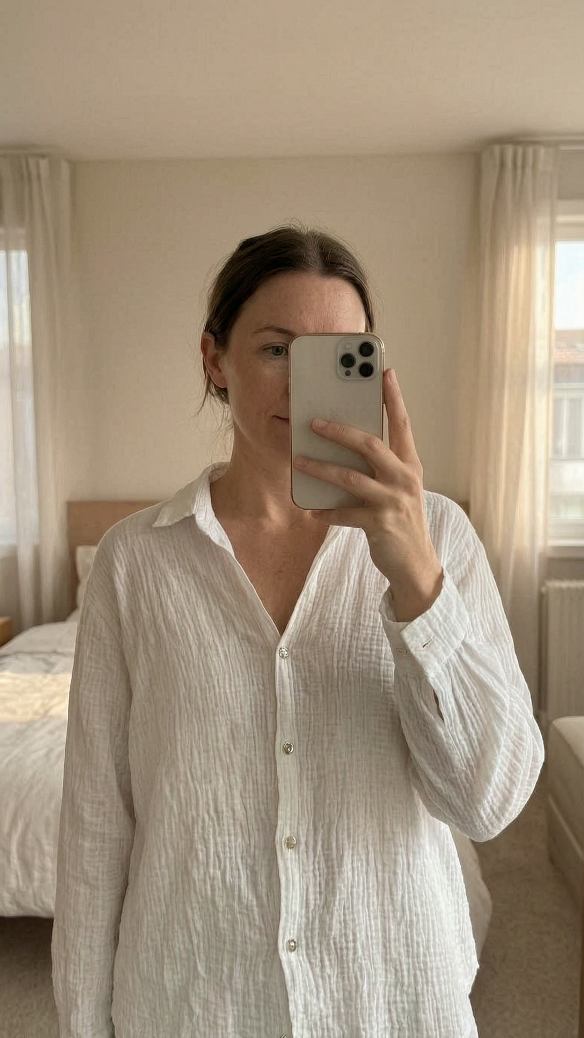 Chemise gaz de coton blanche S - Camicia donna in piedi, rivolto verso la fotocamera, in una camera da letto con luce soffusa e luce naturale che filtra dalla finestra.