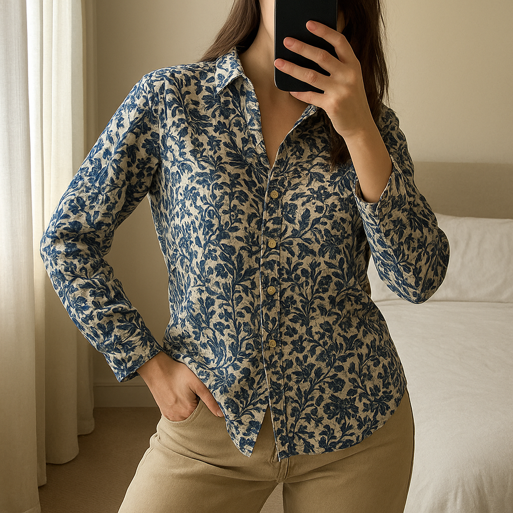 Una persona in Chemise homme gant loose fit S - Camicia uomo skirt man gant s inarcando leggermente la schiena per una posa dinamica, in una camera da letto con luce soffusa e luce naturale che filtra dalla finestra.