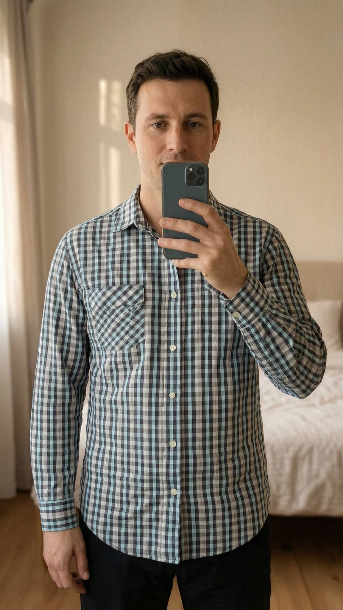 Chemise Homme marque Celio debout, face à la caméra, dans une chambre à la lumière douce, avec une lumière naturelle filtrant par la fenêtre.