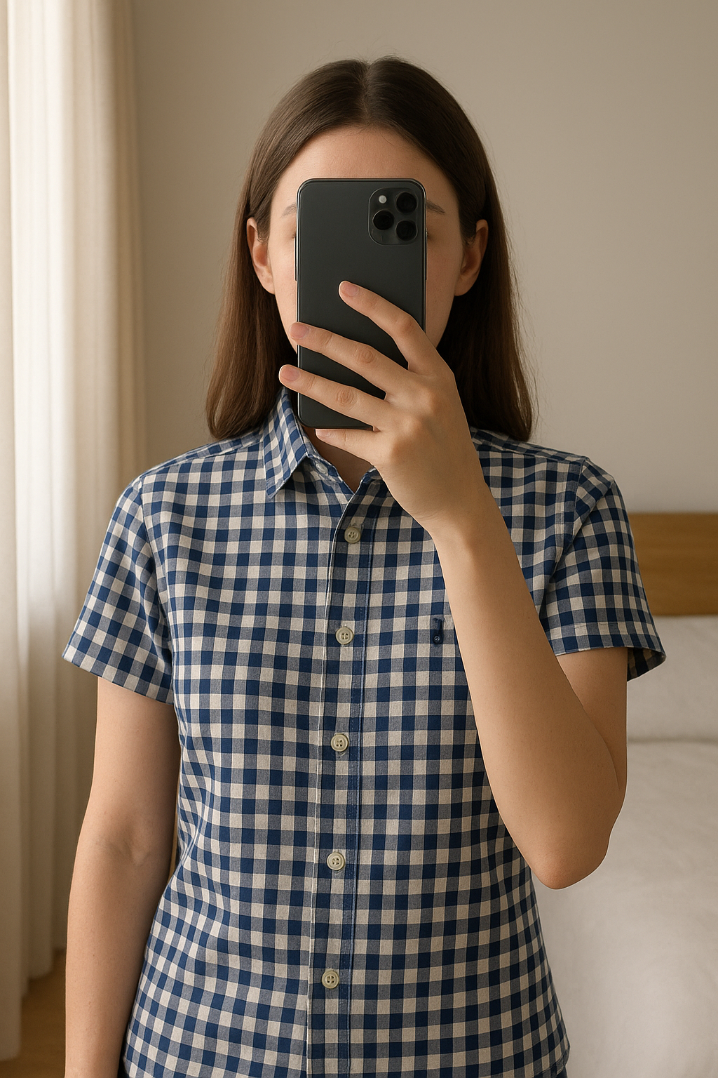 Chemise jacadi debout, face à la caméra, dans une chambre à la lumière douce, avec une lumière naturelle filtrant par la fenêtre.