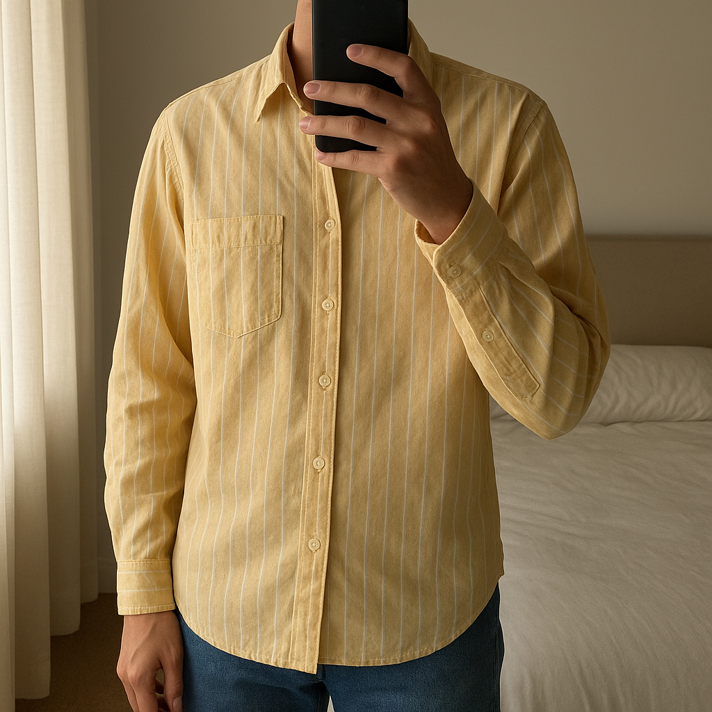 Chemise jaune à rayures Uniqlo homme L - slim fit - Camicia uomo skirt man in piedi, rivolto verso la fotocamera, in una camera da letto con luce soffusa e luce naturale che filtra dalla finestra.