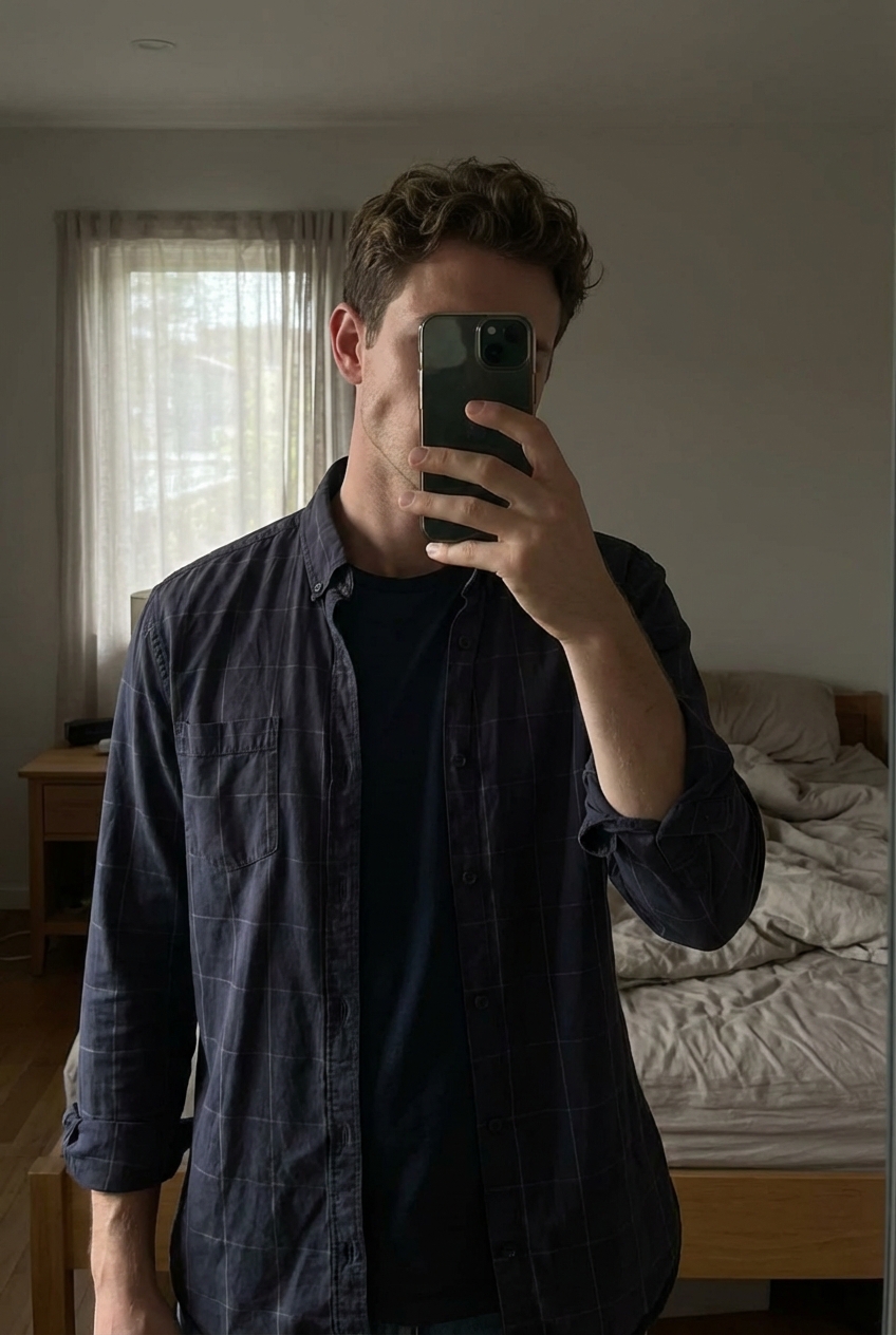 Chemise Jules debout, face à la caméra, dans une chambre à la lumière douce, avec une lumière naturelle filtrant par la fenêtre.