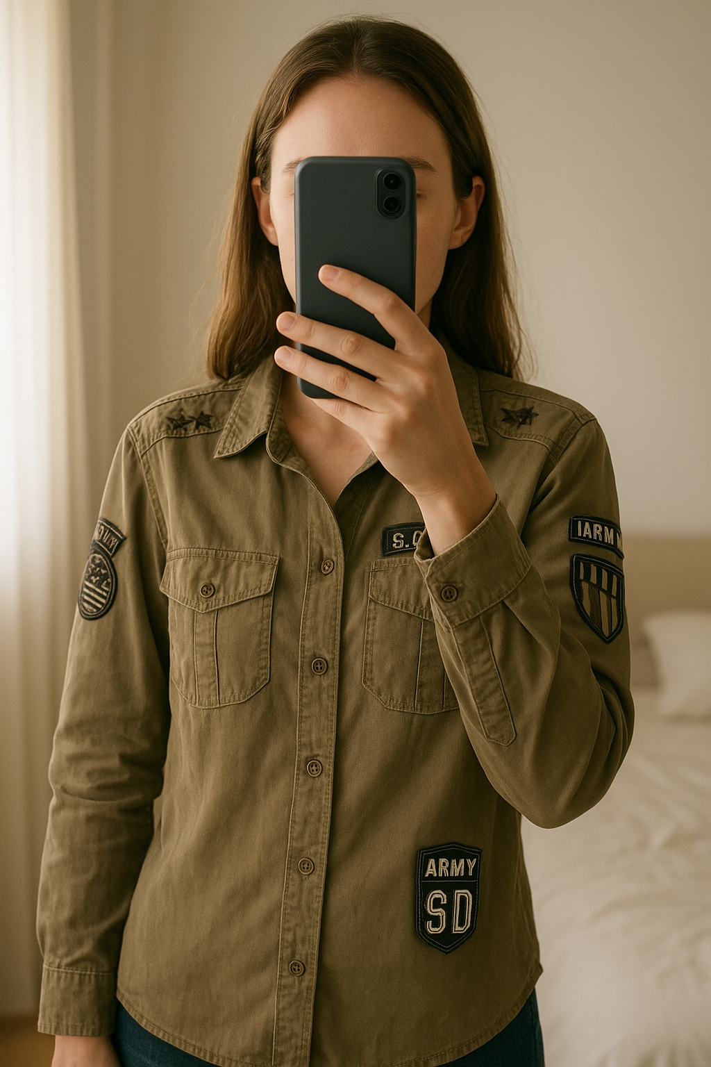 Chemise kaki debout, face à la caméra, dans une chambre à la lumière douce, avec une lumière naturelle filtrant par la fenêtre.