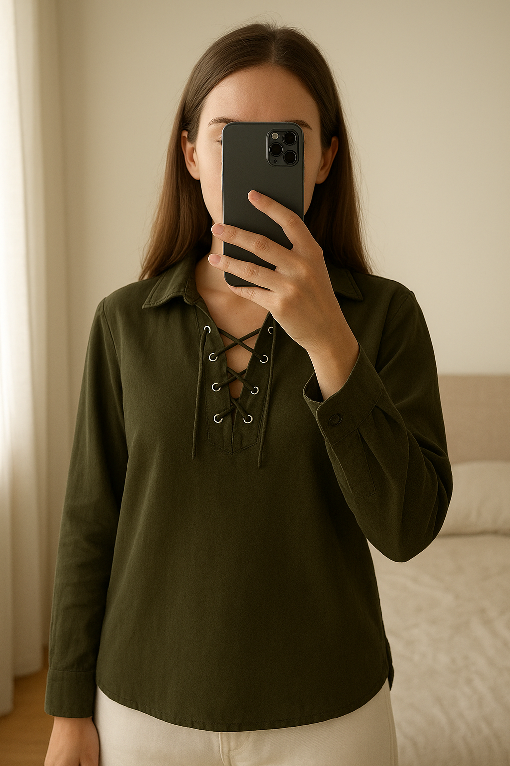 Chemise kaki JUSTfab debout, face à la caméra, dans une chambre à la lumière douce, avec une lumière naturelle filtrant par la fenêtre.
