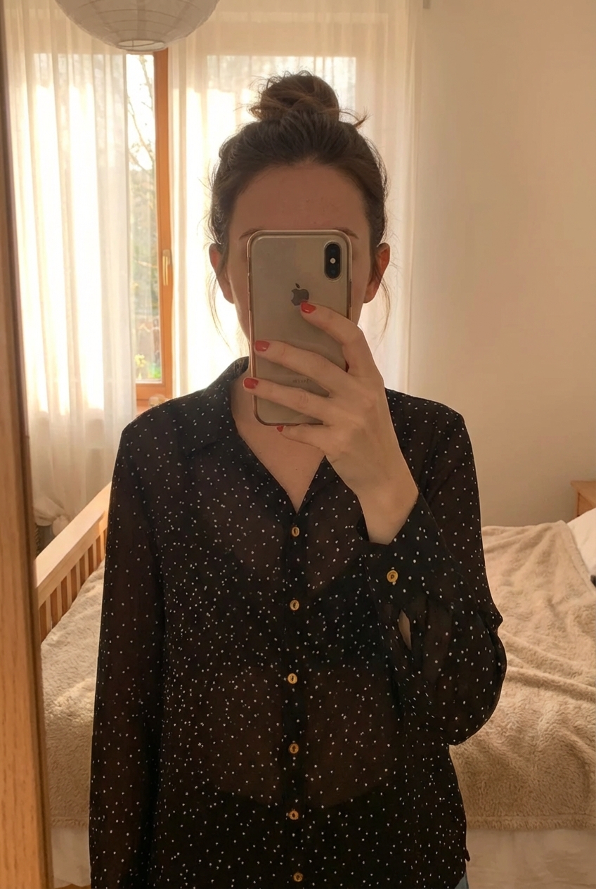 Chemise noire à pois blanc M debout, face à la caméra, dans une chambre à la lumière douce, avec une lumière naturelle filtrant par la fenêtre.