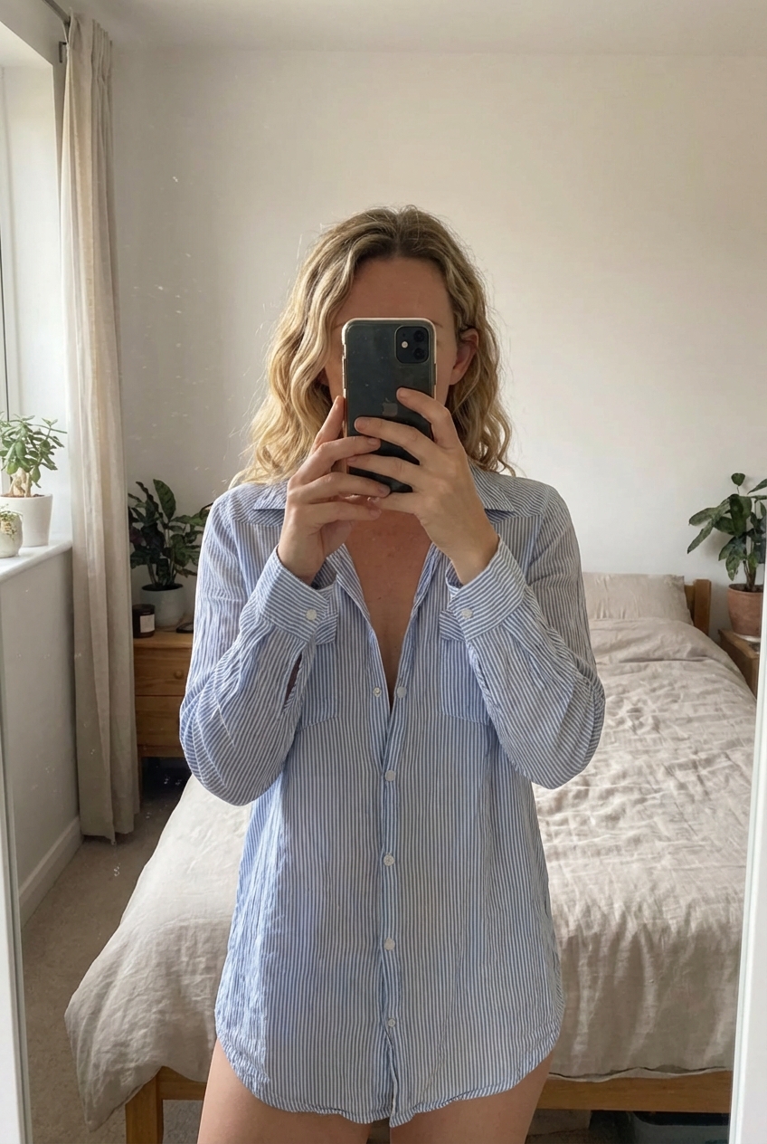 Chemise rayé bleu et blanc Pimkie debout, face à la caméra, dans une chambre à la lumière douce, avec une lumière naturelle filtrant par la fenêtre.