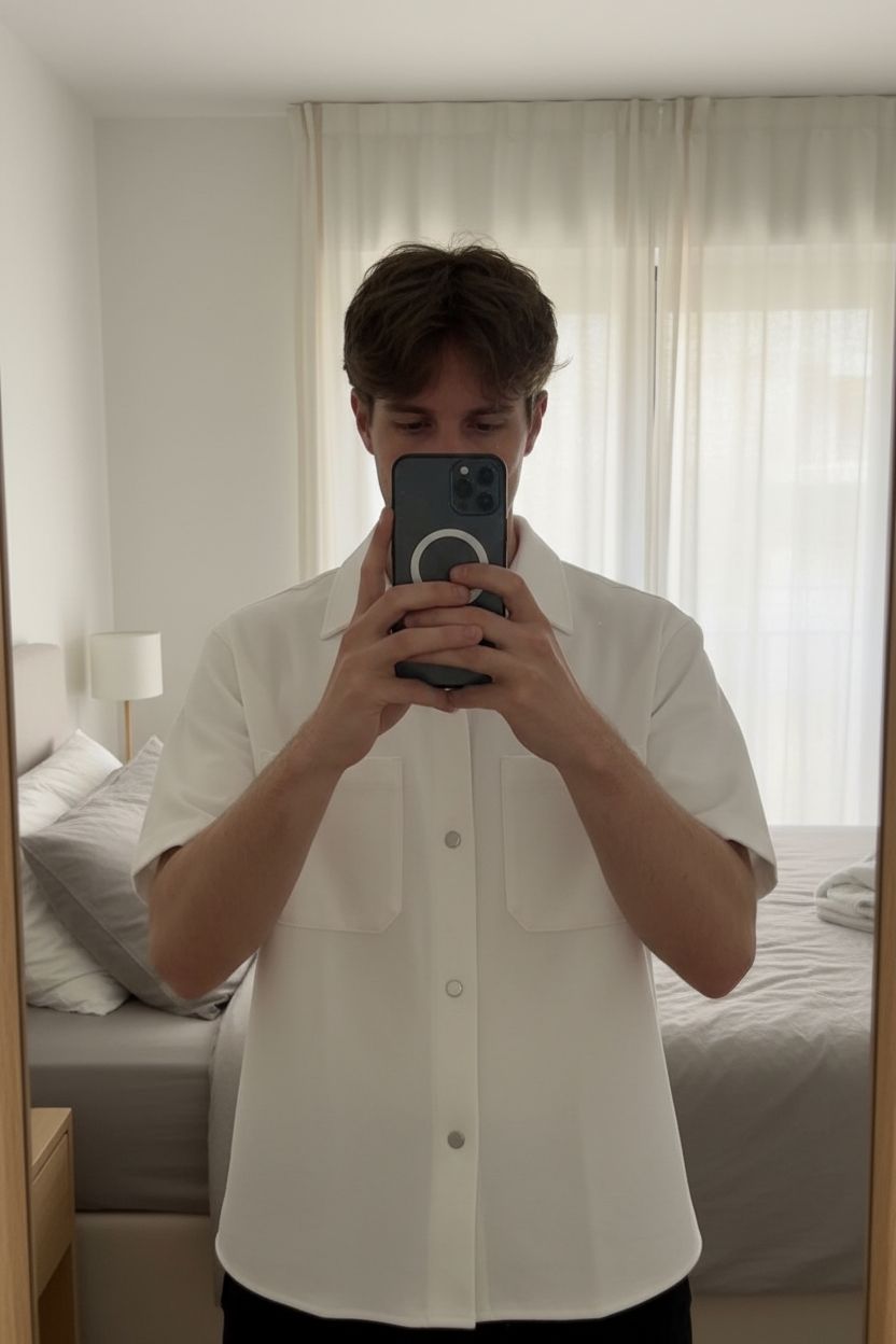 🤍 Chemise Zara blanche coupe droite debout, face à la caméra, dans une chambre à la lumière douce, avec une lumière naturelle filtrant par la fenêtre.
