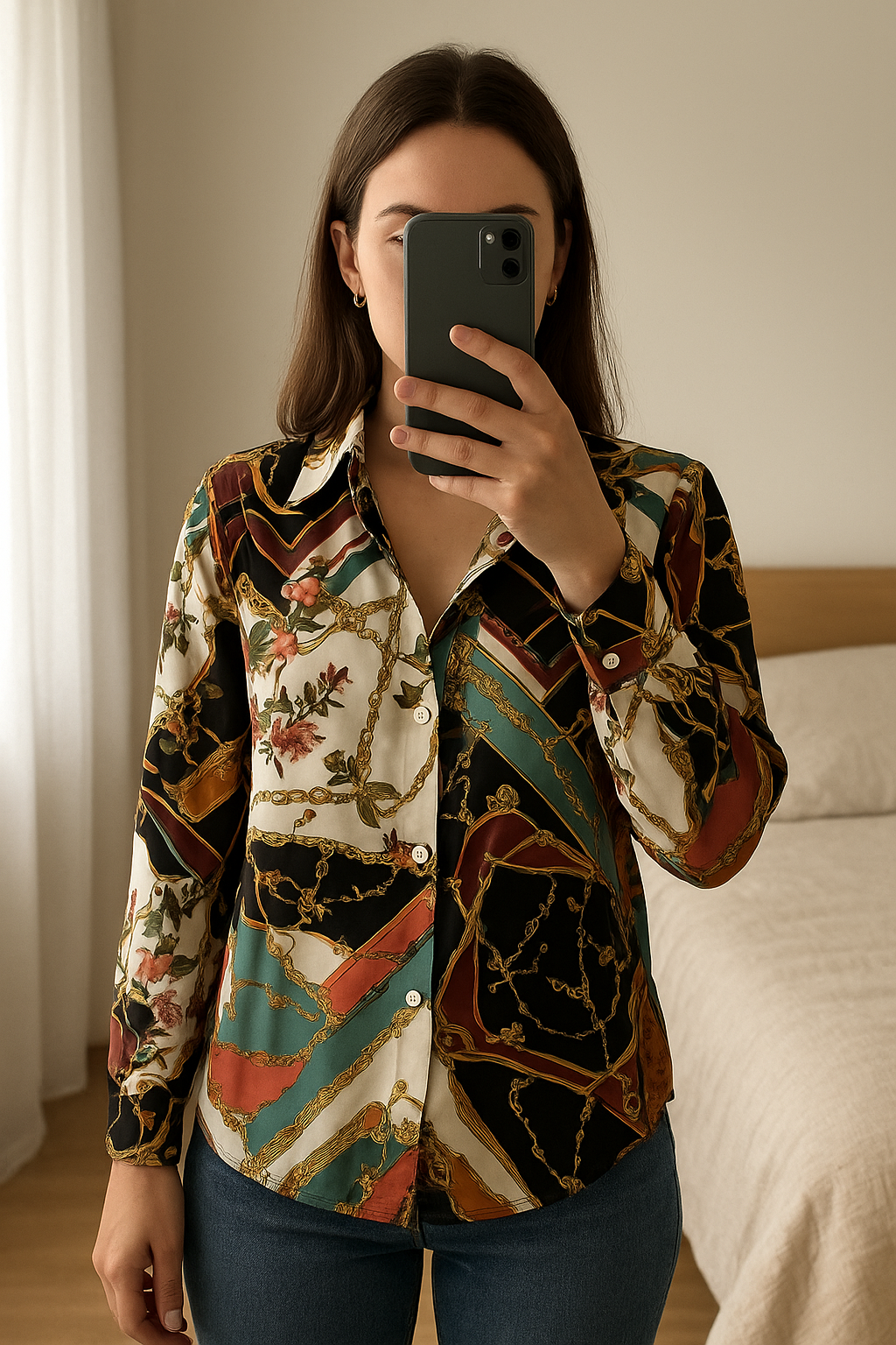 Chemise Zara motif chaînes debout, face à la caméra, dans une chambre à la lumière douce, avec une lumière naturelle filtrant par la fenêtre.