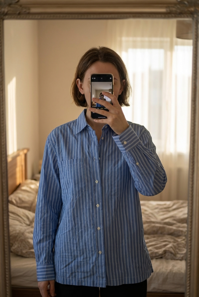 Chemise Zara rayée bleu S – Neuve avec étiquette debout, face à la caméra, dans une chambre à la lumière douce, avec une lumière naturelle filtrant par la fenêtre.
