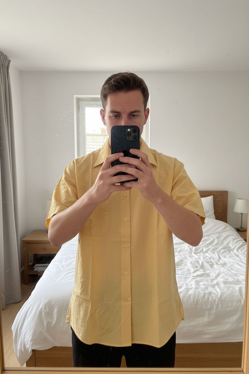 Chemisette jaune Brice debout, face à la caméra, dans une chambre à la lumière douce, avec une lumière naturelle filtrant par la fenêtre.