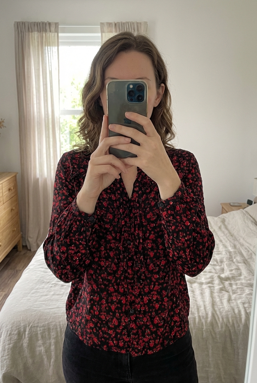 Chemisier promod debout, face à la caméra, dans une chambre à la lumière douce, avec une lumière naturelle filtrant par la fenêtre.