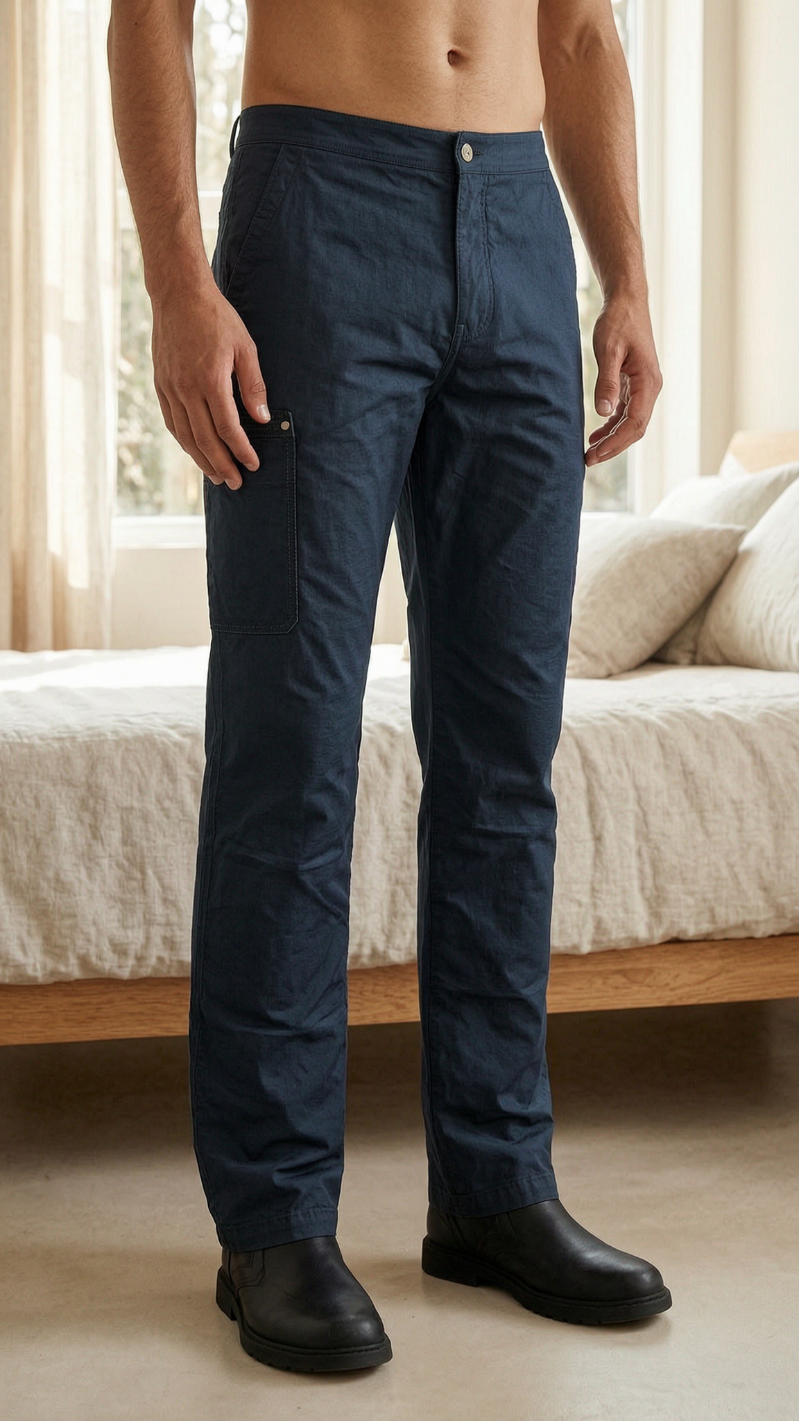 Ciesse Pantaloni uomo in piedi, rivolto verso la fotocamera, in una camera da letto con luce soffusa e luce naturale che filtra dalla finestra.