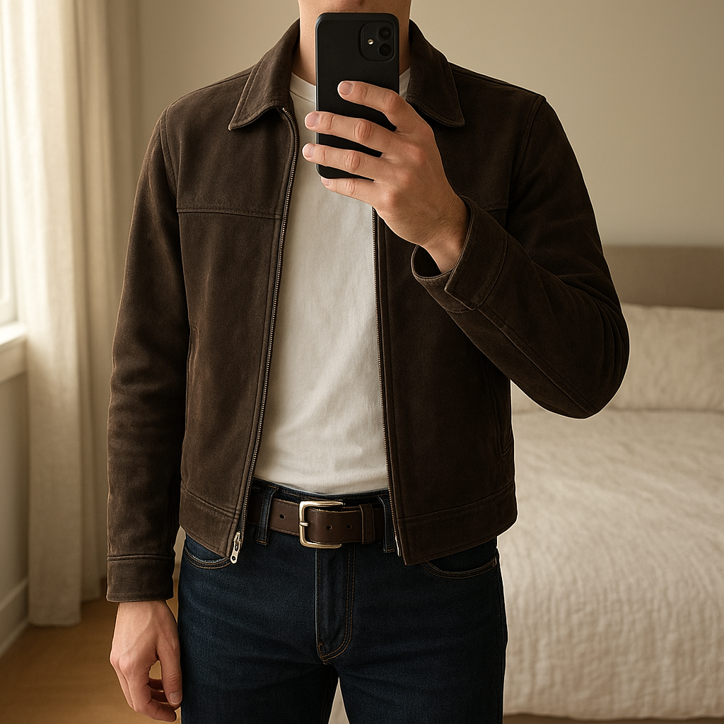 Cintura in Lussuosa Pelle Scamosciata Marrone Scuro 🍫 | Fibbia Cromata Elegante in piedi, rivolto verso la fotocamera, in una camera da letto con luce soffusa e luce naturale che filtra dalla finestra.