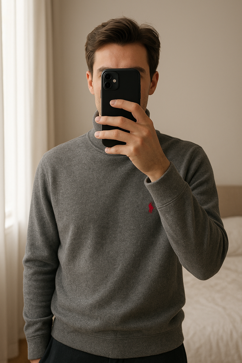 Col roulé taille M debout, face à la caméra, dans une chambre à la lumière douce, avec une lumière naturelle filtrant par la fenêtre.