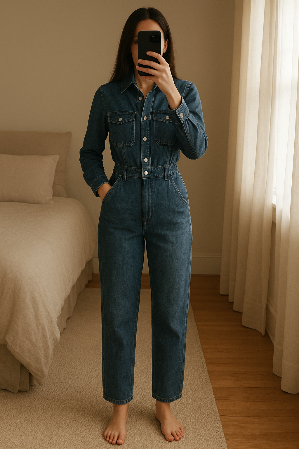 Combi jean debout, face à la caméra, dans une chambre à la lumière douce, avec une lumière naturelle filtrant par la fenêtre.