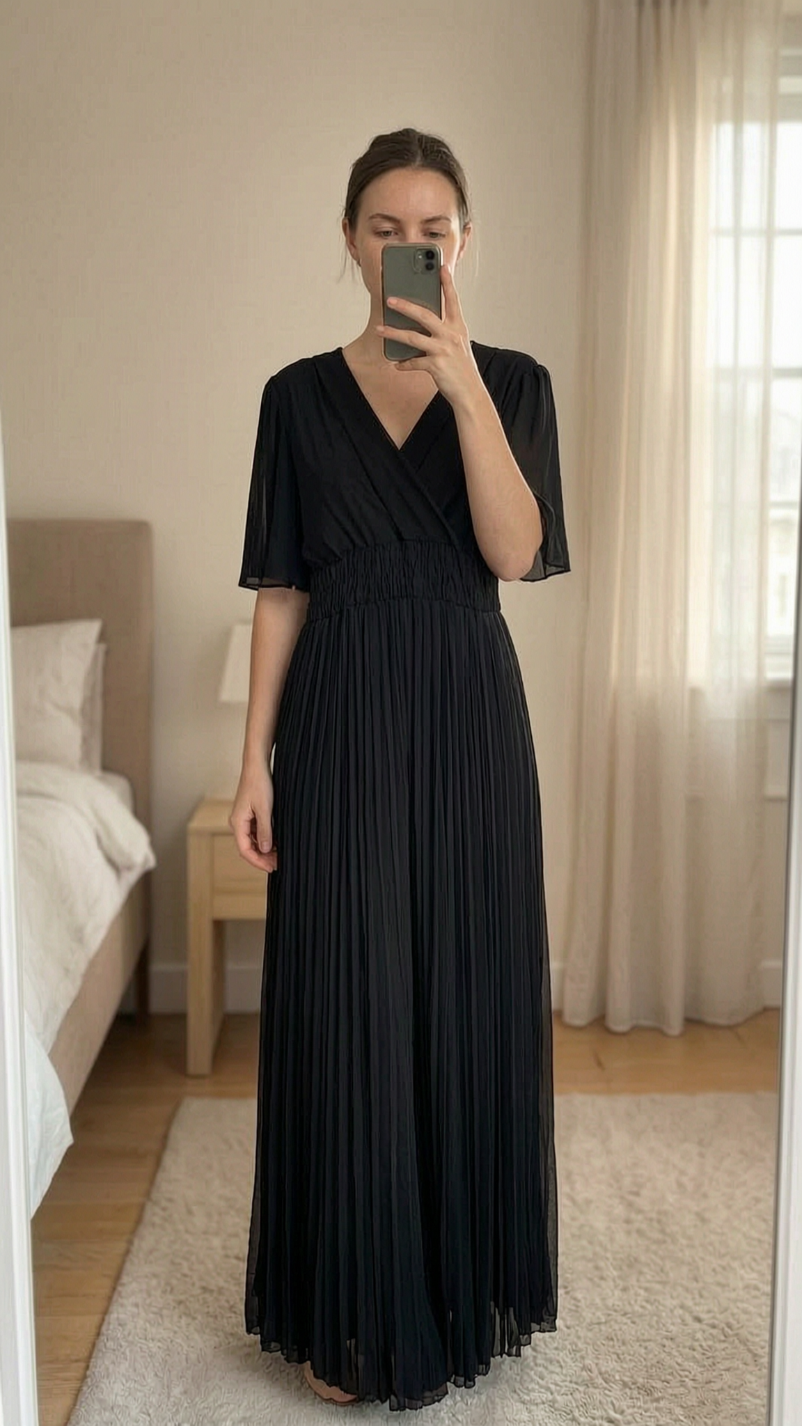 Combipantalon noir été femme M tute jumpsuit Donna M in piedi, rivolto verso la fotocamera, in una camera da letto con luce soffusa e luce naturale che filtra dalla finestra.