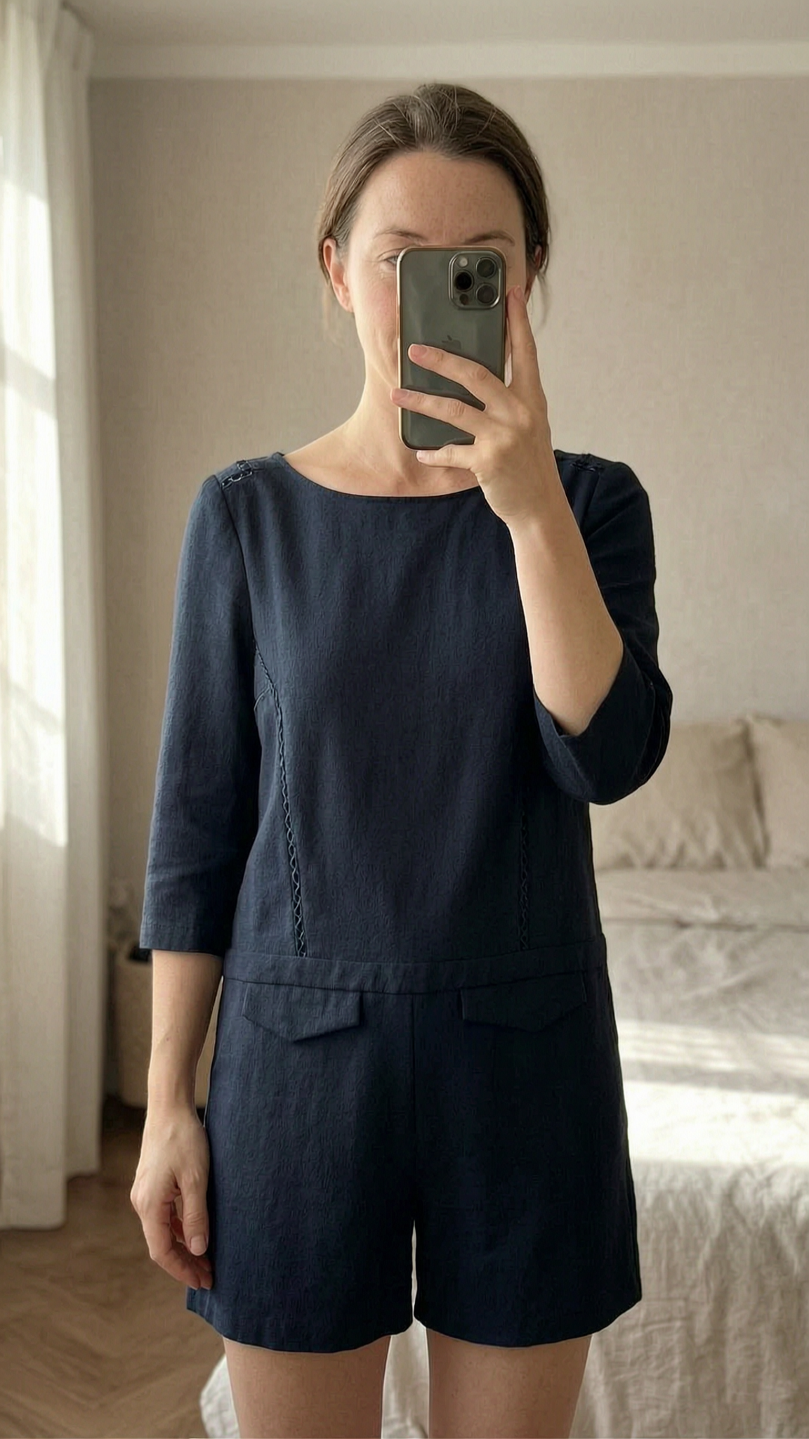 Combishort courte dos nu BASH. debout, face à la caméra, dans une chambre à la lumière douce, avec une lumière naturelle filtrant par la fenêtre.