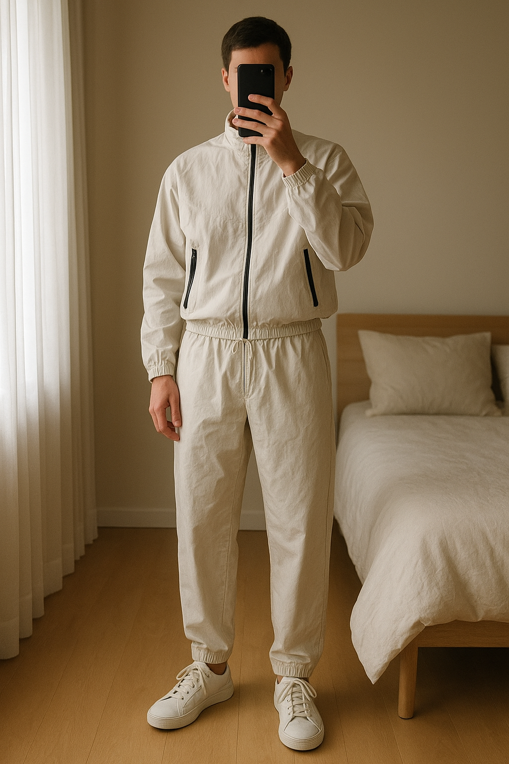 Coordinato Tuta Bianco Baggy. in piedi, rivolto verso la fotocamera, in una camera da letto con luce soffusa e luce naturale che filtra dalla finestra.