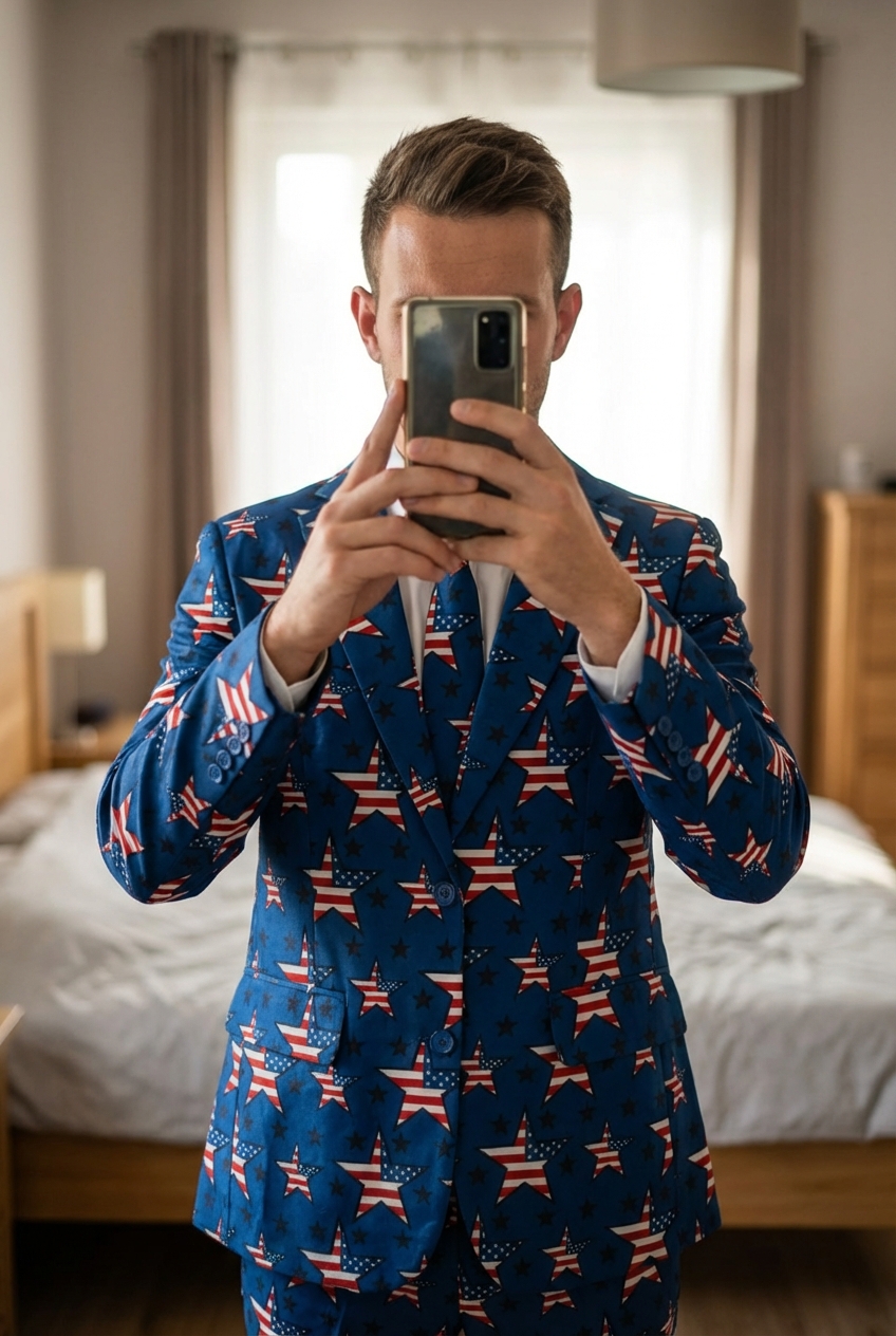 Costume drapeau américain Suitmeister debout, face à la caméra, dans une chambre à la lumière douce, avec une lumière naturelle filtrant par la fenêtre.