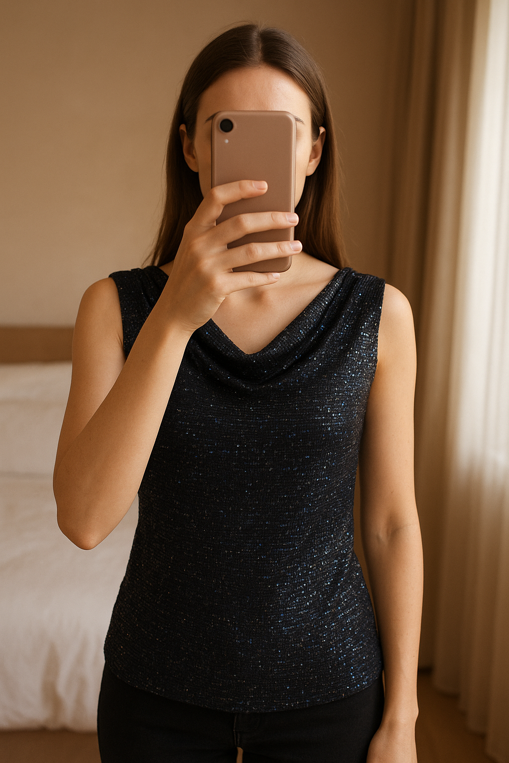 Débardeur col bénitier à sequins Taille M debout, face à la caméra, dans une chambre à la lumière douce, avec une lumière naturelle filtrant par la fenêtre.