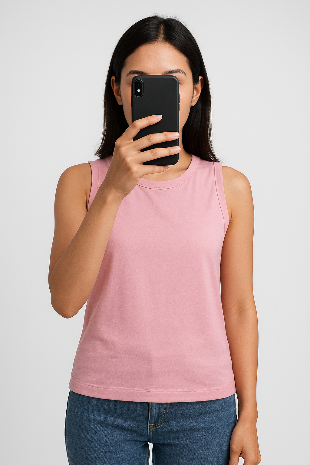 Une personne en Débardeur coton rose femme cyrillus debout, face à la caméra, avec une silhouette fine, dans un studio photo épuré avec fond blanc et éclairage doux.