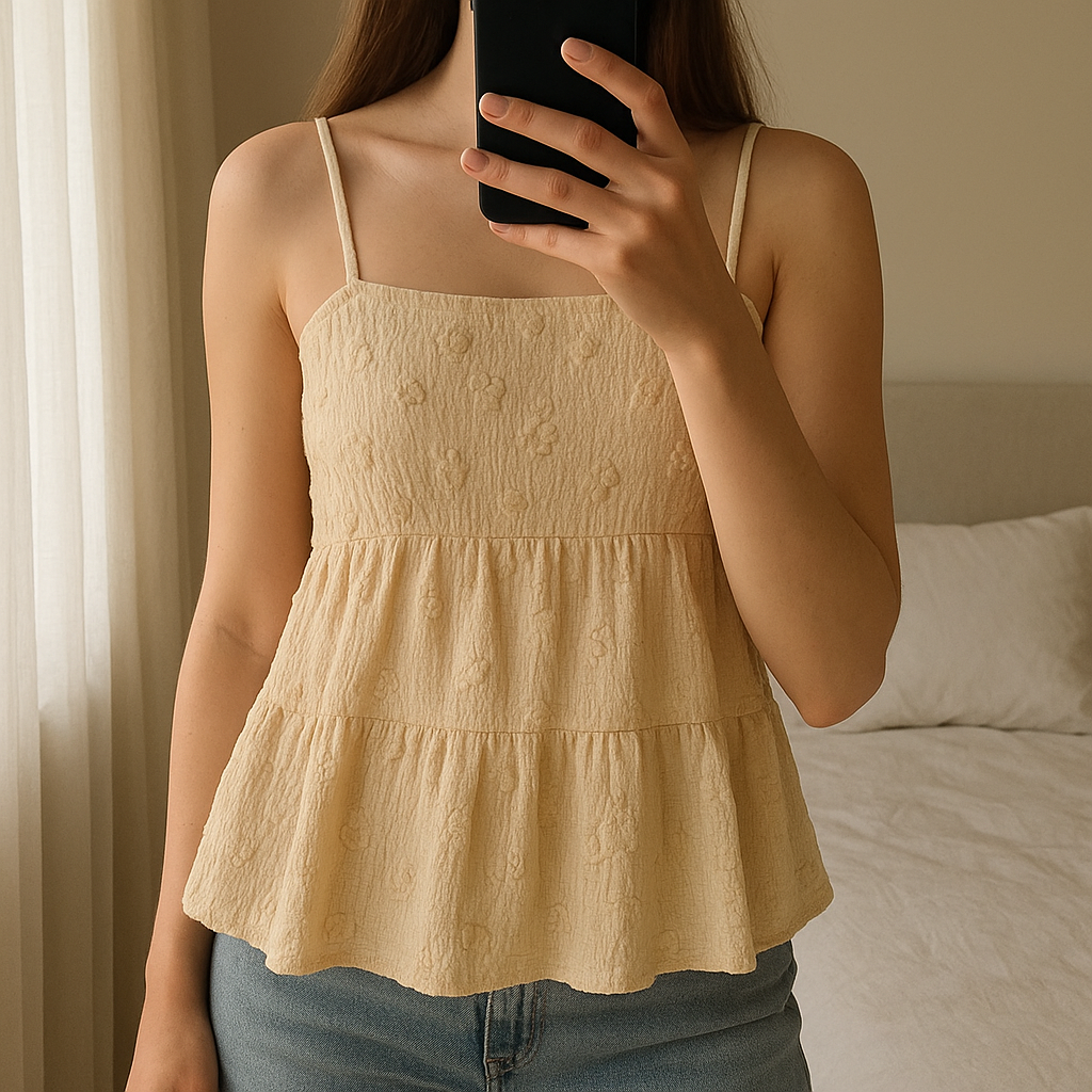 Débardeur jaune debout, face à la caméra, dans une chambre à la lumière douce, avec une lumière naturelle filtrant par la fenêtre.