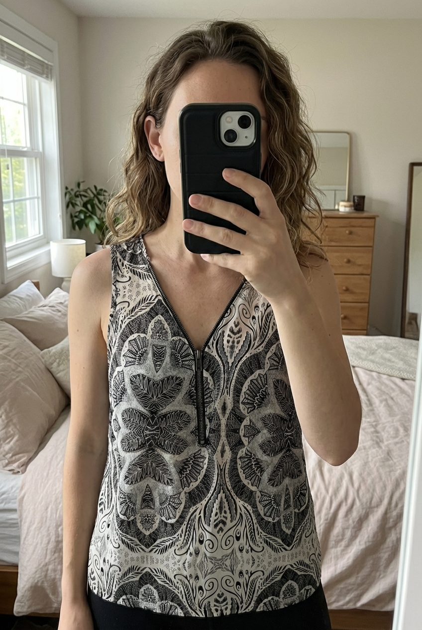 Débardeur one step 42 debout, face à la caméra, dans une chambre à la lumière douce, avec une lumière naturelle filtrant par la fenêtre.