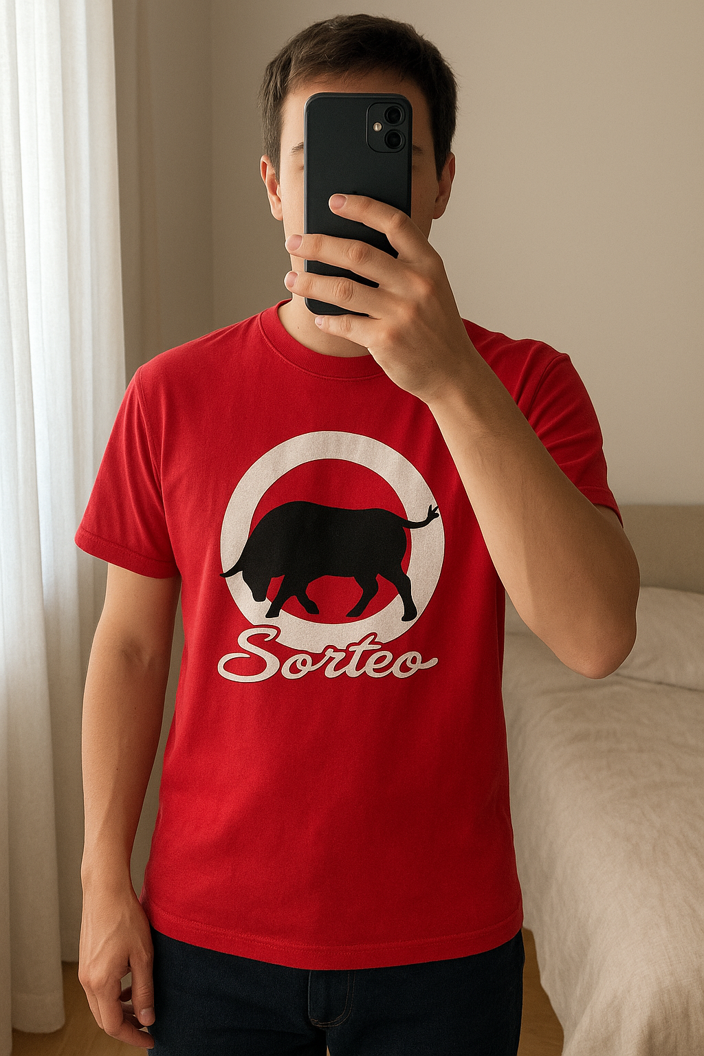 Débardeur rouge sorteo debout, face à la caméra, dans une chambre à la lumière douce, avec une lumière naturelle filtrant par la fenêtre.