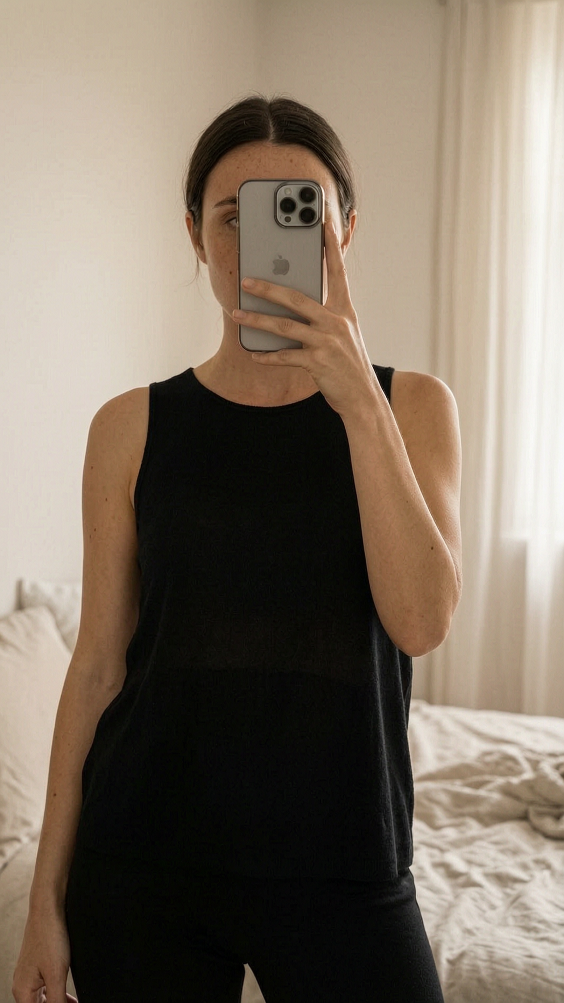 De ardeur léger fluide M - canotte donna estate M in piedi, rivolto verso la fotocamera, in una camera da letto con luce soffusa e luce naturale che filtra dalla finestra.