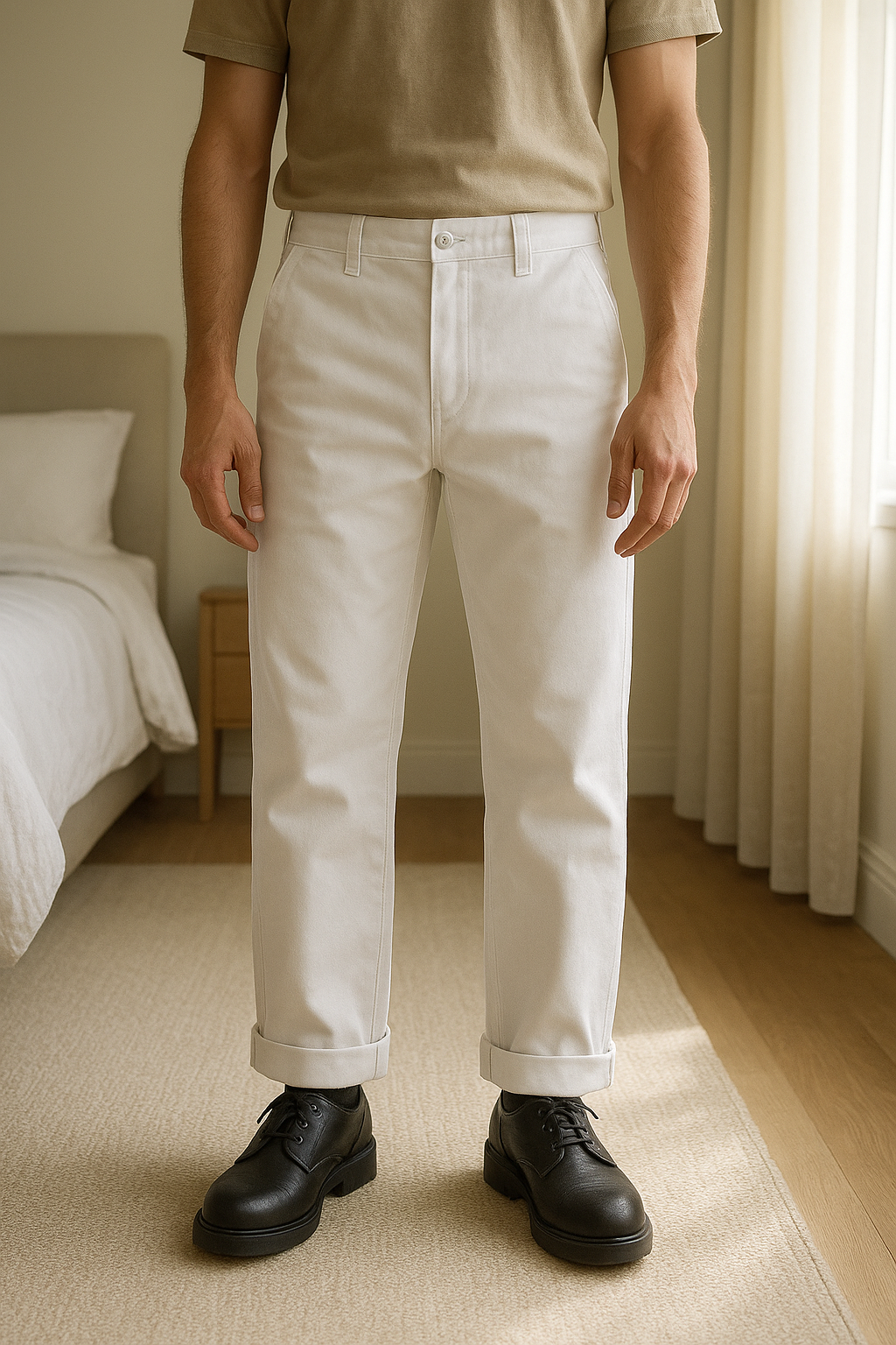 Dickies 874 in piedi, rivolto verso la fotocamera, in una camera da letto con luce soffusa e luce naturale che filtra dalla finestra.