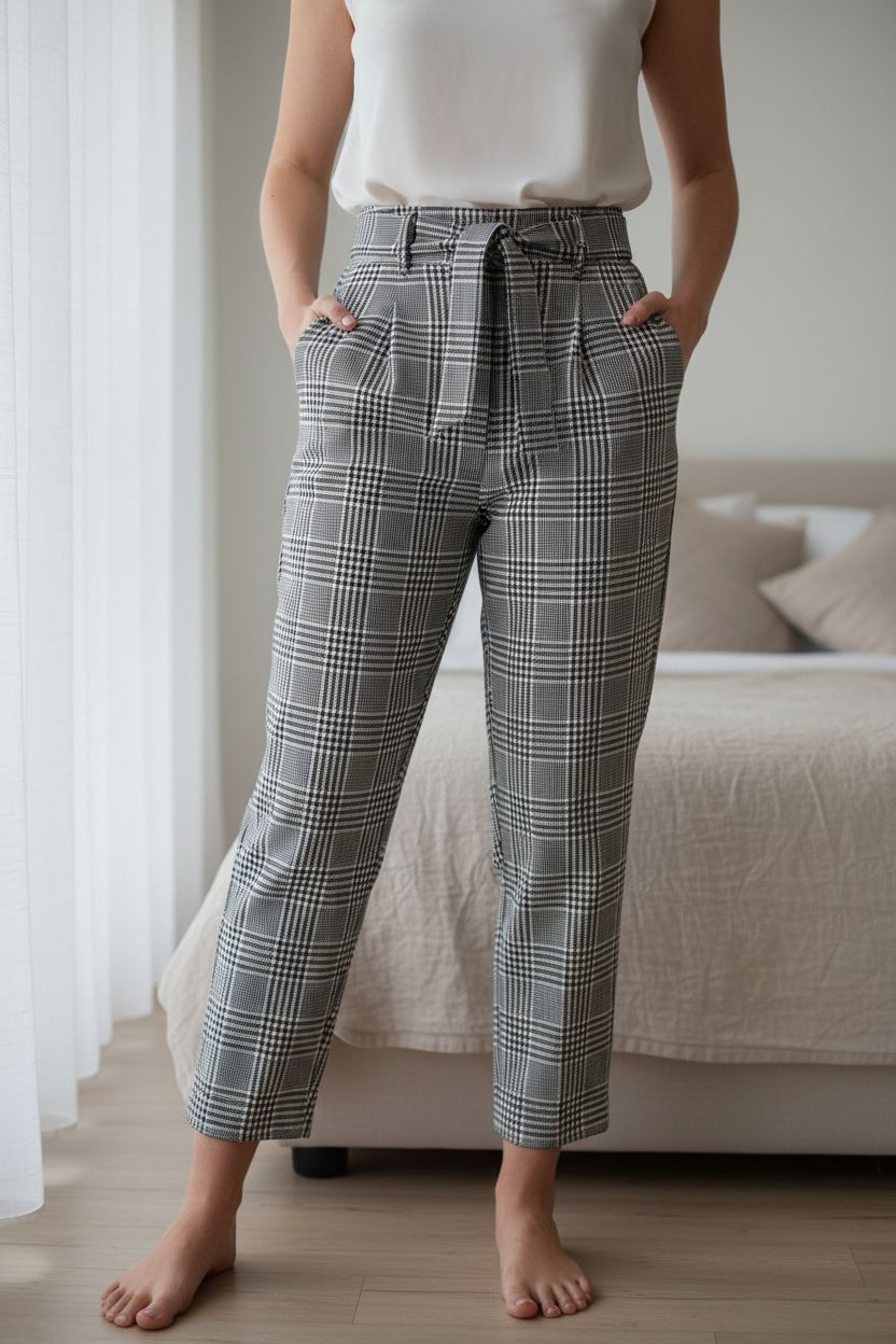 Dorothy Perkins Check Trousers UK8 Black White Plaid Belted Wide leg Smart Pants standing straight facing the camera, in a softly lit bedroom setting, with gentle natural light filtering through a window.