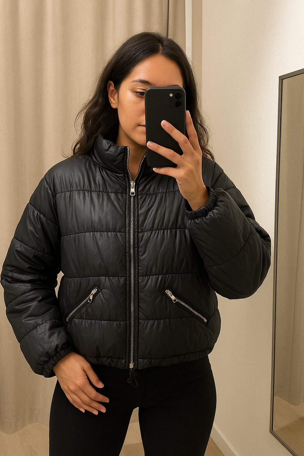 Une personne en Doudoune noire courte femme – zippée – style urbain cambrant légèrement le dos pour une pose dynamique, dans une cabine d’essayage de style boutique avec un miroir et une décoration neutre.