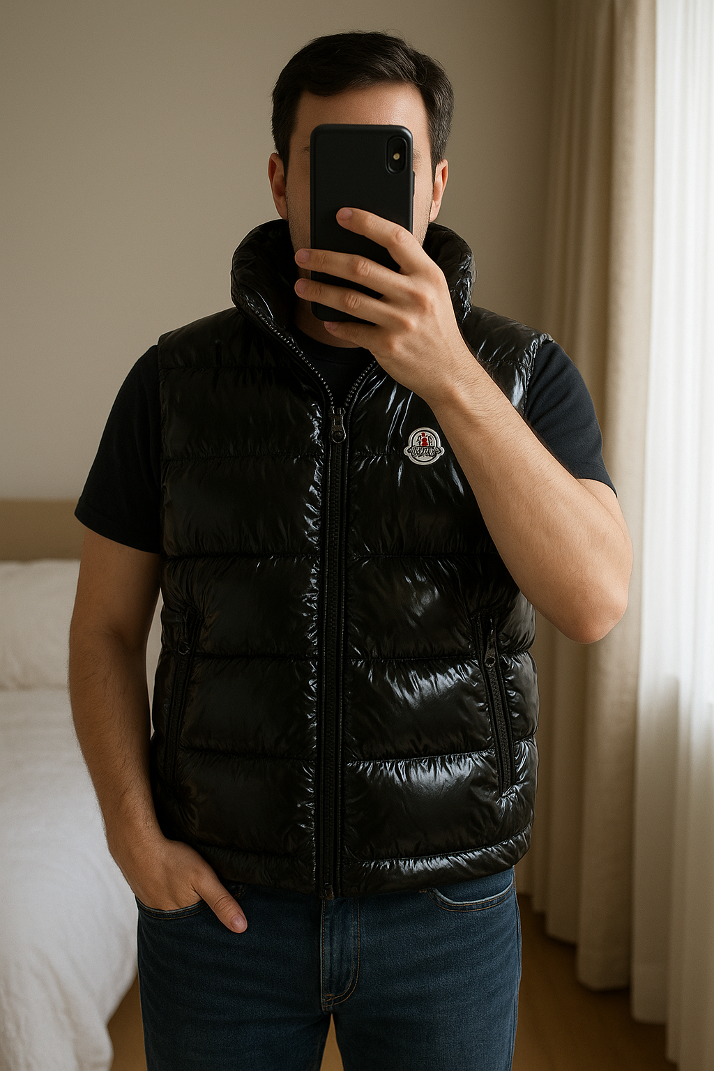 Doudoune sans manche moncler debout, face à la caméra, dans une chambre à la lumière douce, avec une lumière naturelle filtrant par la fenêtre.
