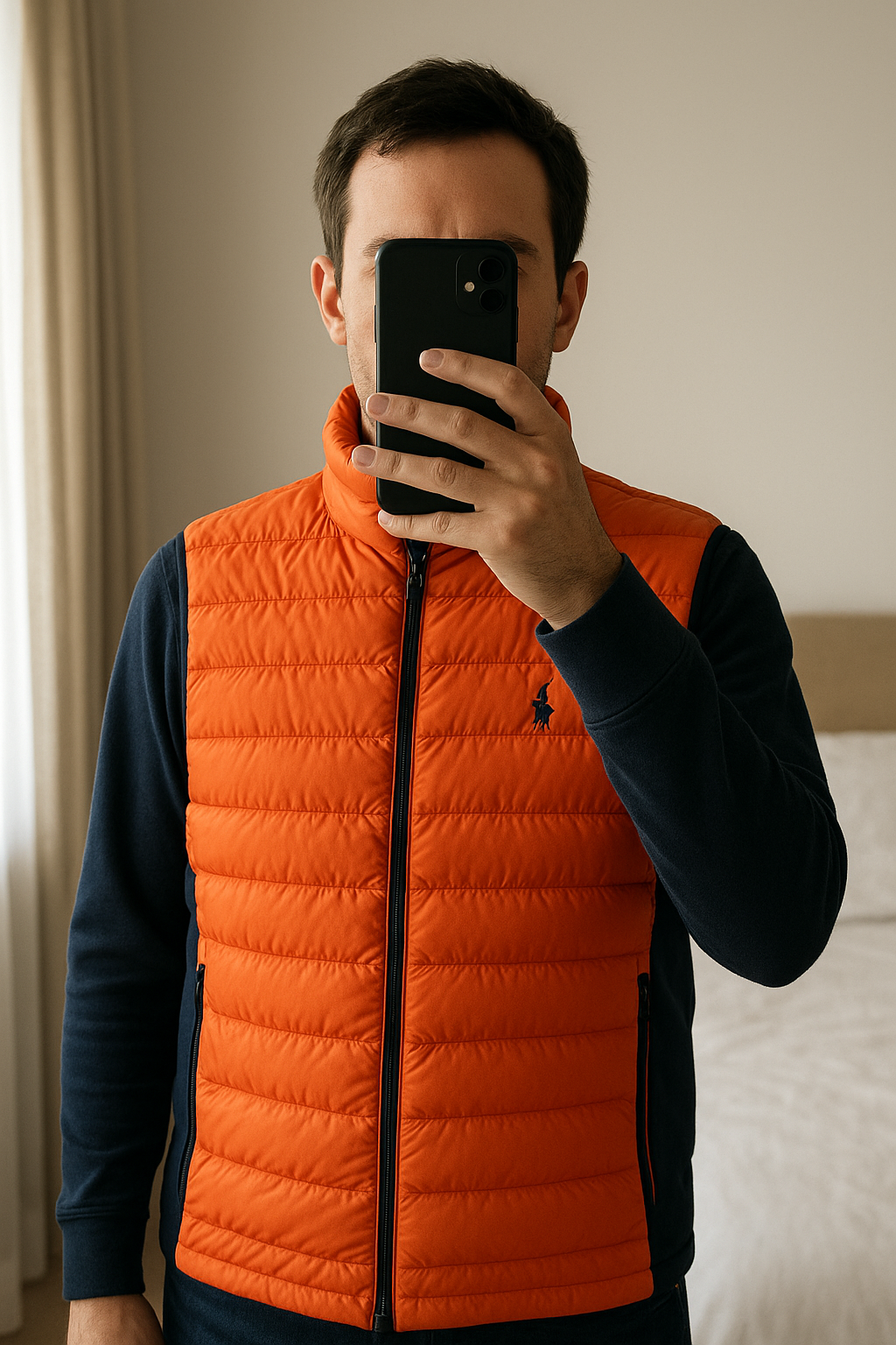 Doudoune Sans Manches Ralph Lauren Orange ThermoPlume PrimaLoft debout, face à la caméra, dans une chambre à la lumière douce, avec une lumière naturelle filtrant par la fenêtre.
