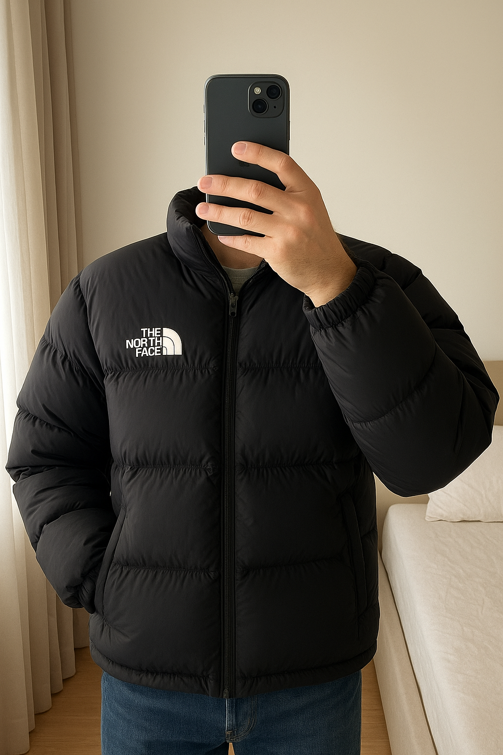 Doudoune The North Face 700 Homme - Taille L - Duvet Lhotse debout, face à la caméra, dans une chambre à la lumière douce, avec une lumière naturelle filtrant par la fenêtre.