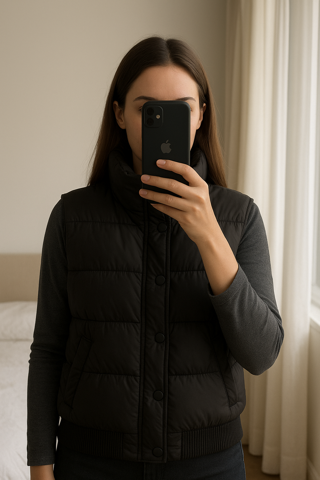 Doudoune ZARA sans manches debout, face à la caméra, dans une chambre à la lumière douce, avec une lumière naturelle filtrant par la fenêtre.
