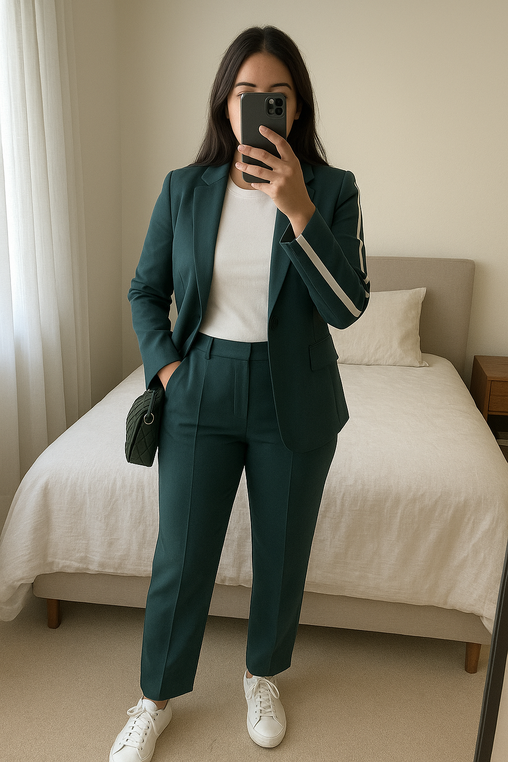 Ensemble blazer pantalon debout, face à la caméra, dans une chambre à la lumière douce, avec une lumière naturelle filtrant par la fenêtre.