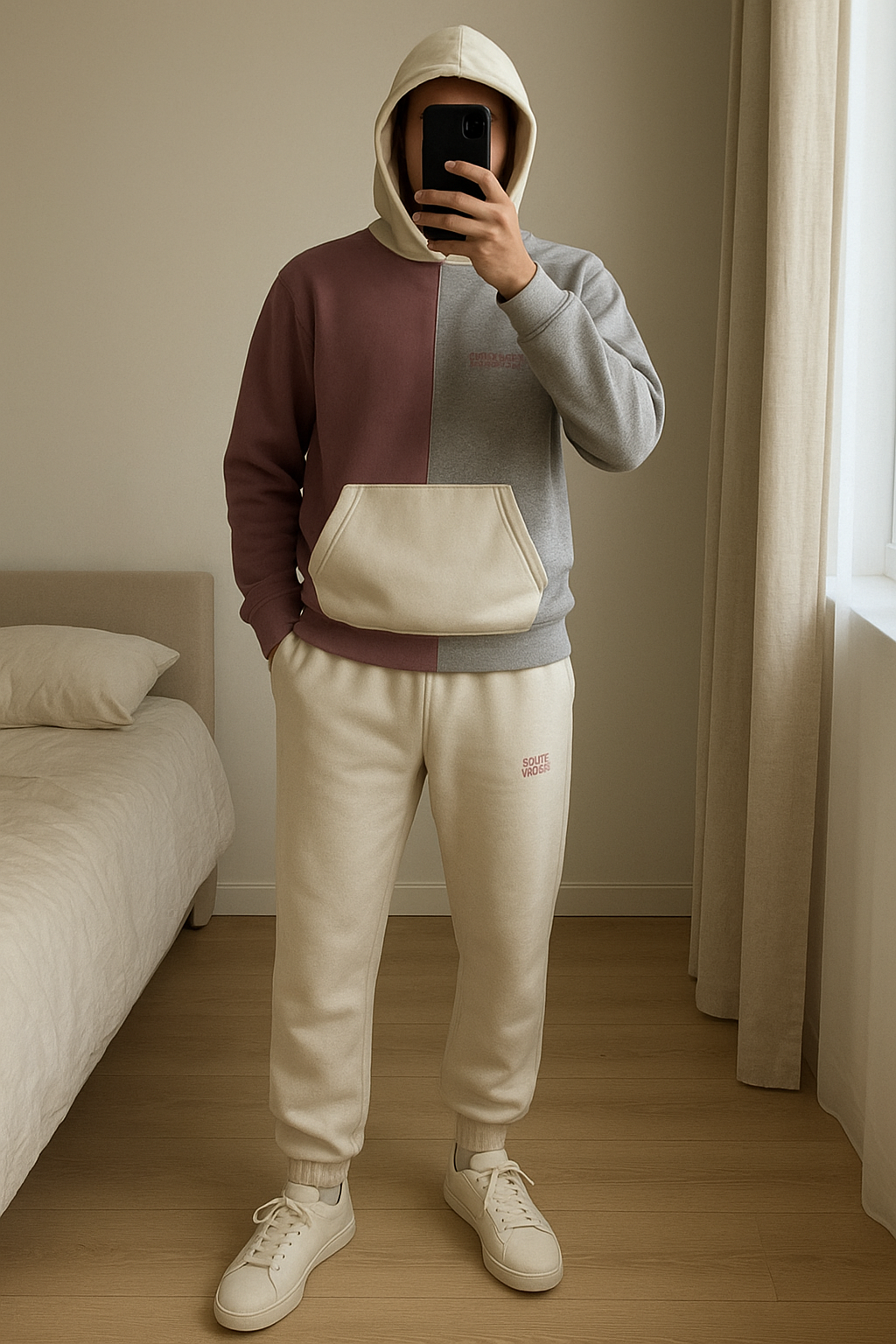 Ensemble BoohooMAN gris,blanc et rose debout, face à la caméra, dans une chambre à la lumière douce, avec une lumière naturelle filtrant par la fenêtre.