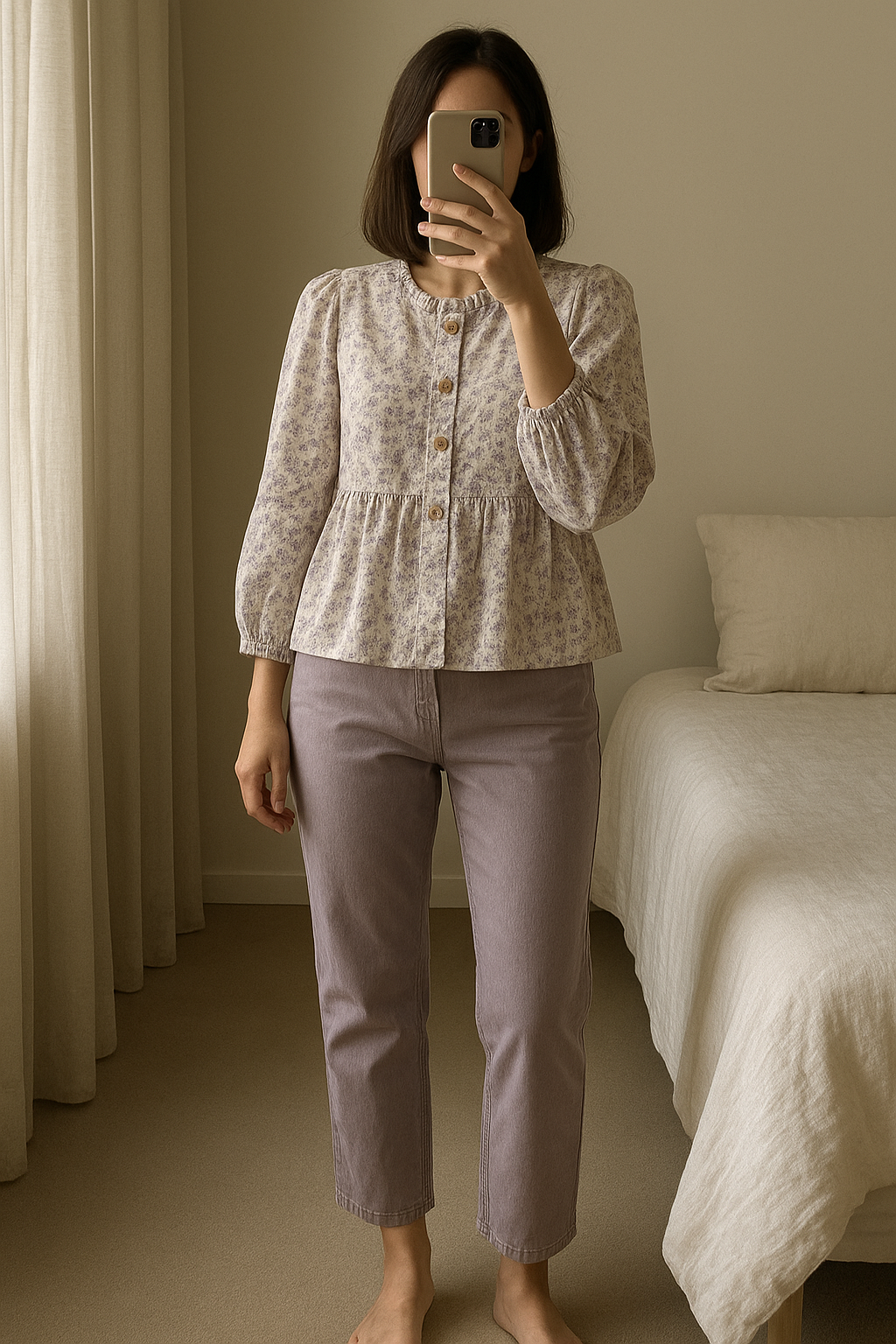 Ensemble chemisier + pantalon fille violet debout, face à la caméra, dans une chambre à la lumière douce, avec une lumière naturelle filtrant par la fenêtre.