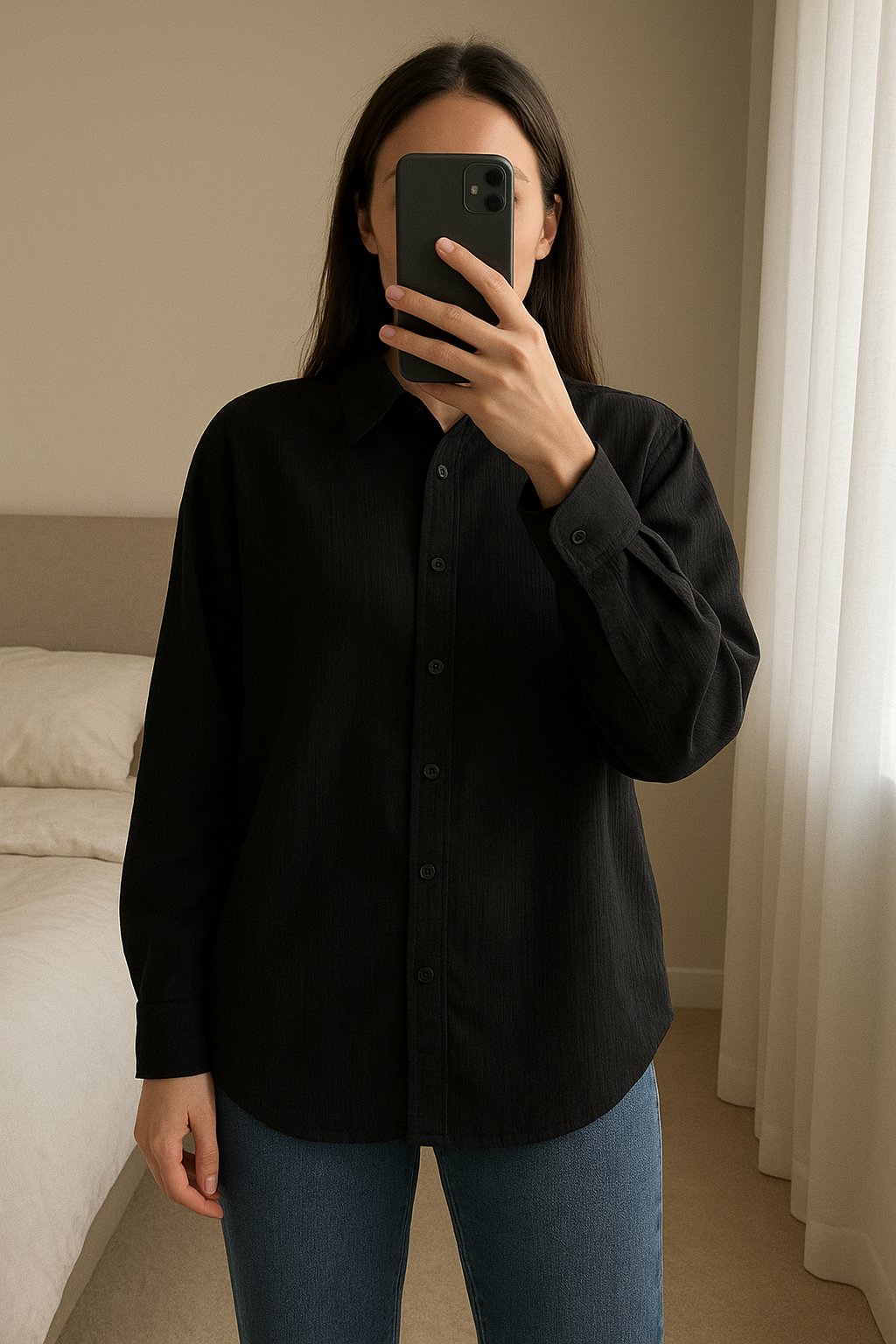 Ensemble large noir debout, face à la caméra, dans une chambre à la lumière douce, avec une lumière naturelle filtrant par la fenêtre.