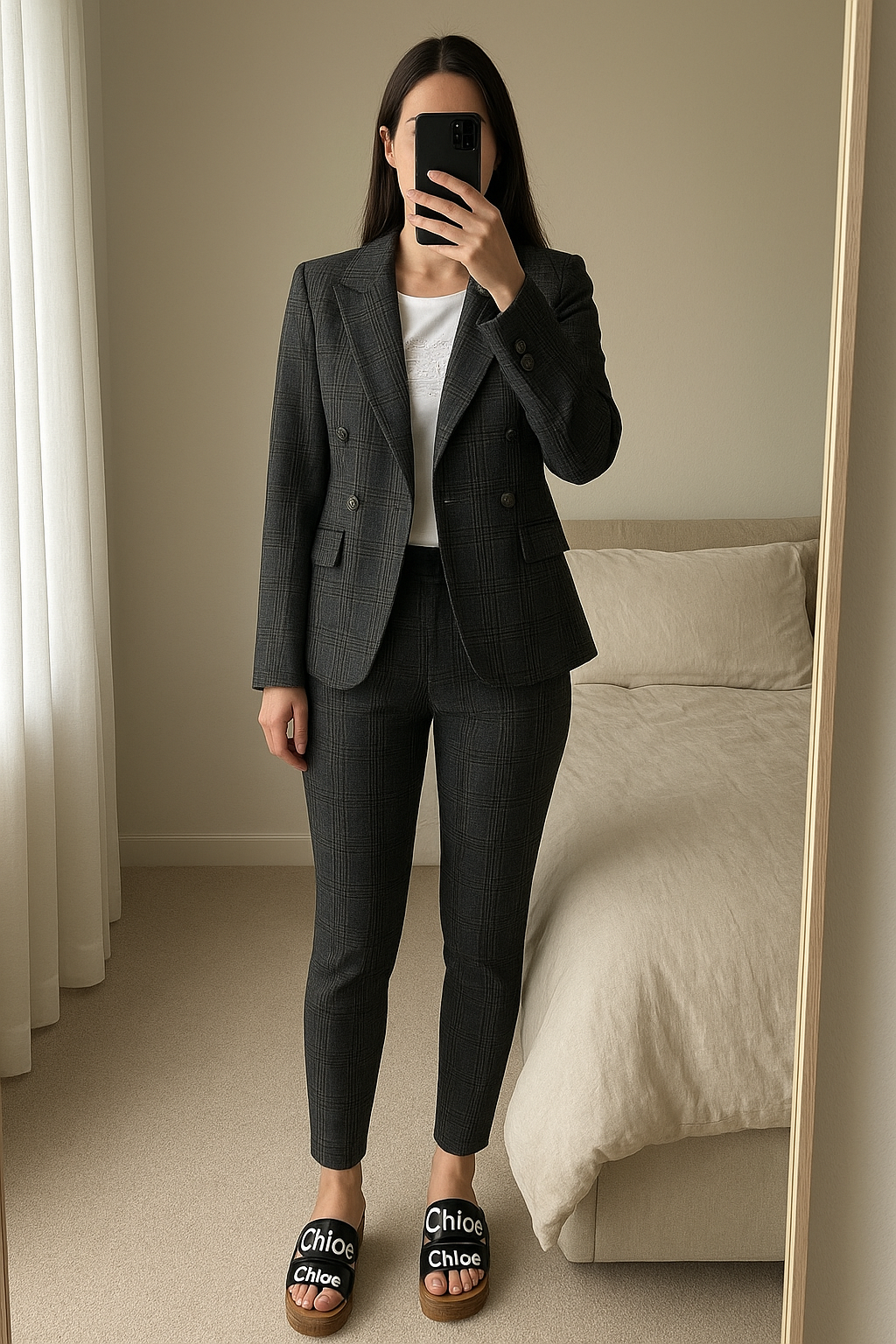 Ensemble les petites bombes motif carreaux debout, face à la caméra, dans une chambre à la lumière douce, avec une lumière naturelle filtrant par la fenêtre.