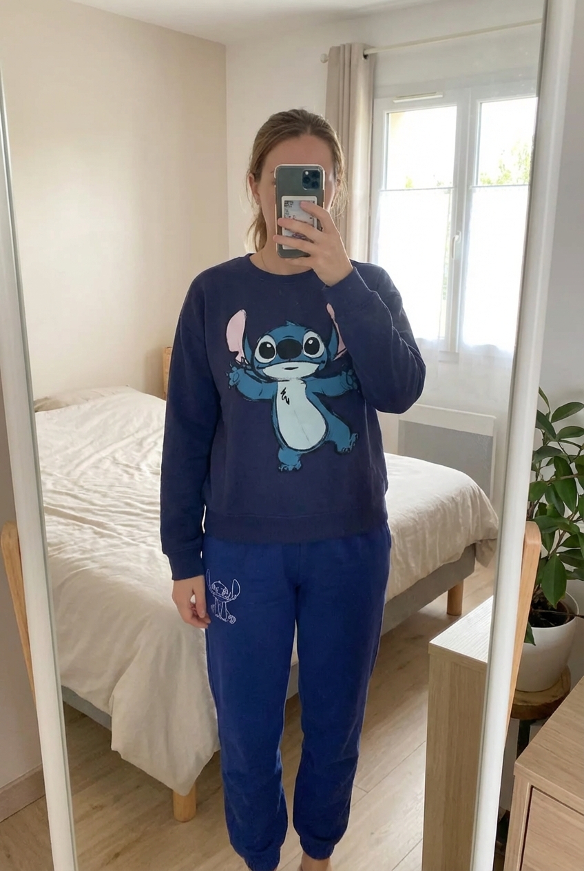 Ensemble Stitch debout, face à la caméra, dans une chambre à la lumière douce, avec une lumière naturelle filtrant par la fenêtre.